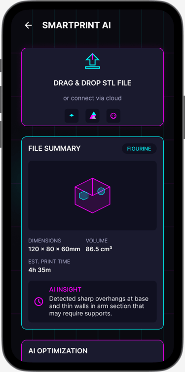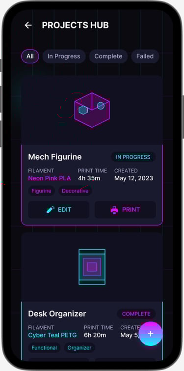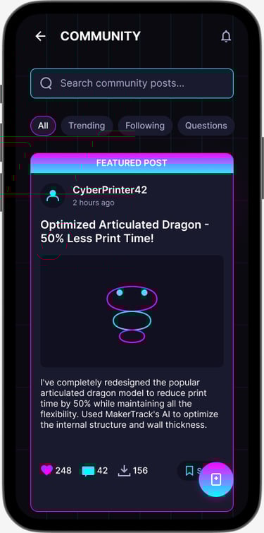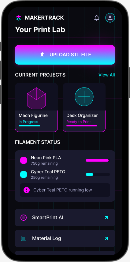 Keep track of filaments, use built-in AI to create sliced projects, refine/tweak existing projects, and provide a message board for users.