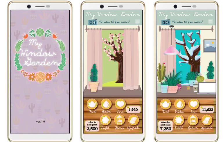 An idle tap windowsill garden building game. Players earn “coins” by watching ads or purchasing coin packs.