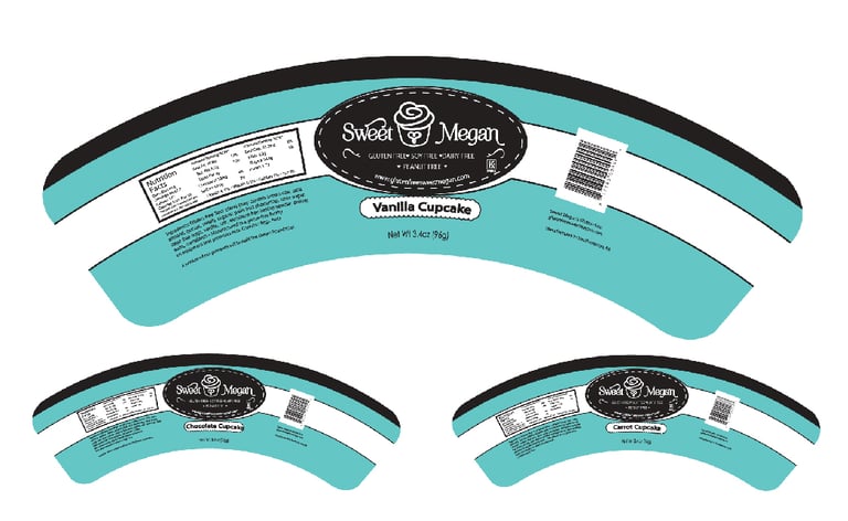 Cupcake packaging labels for a brand sold in Whole Foods.